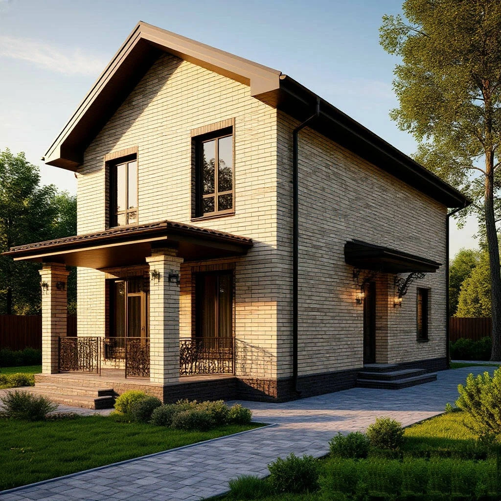 с фактурным кирпичом (рустик, колотый) для баланса гладкости и шероховатости;